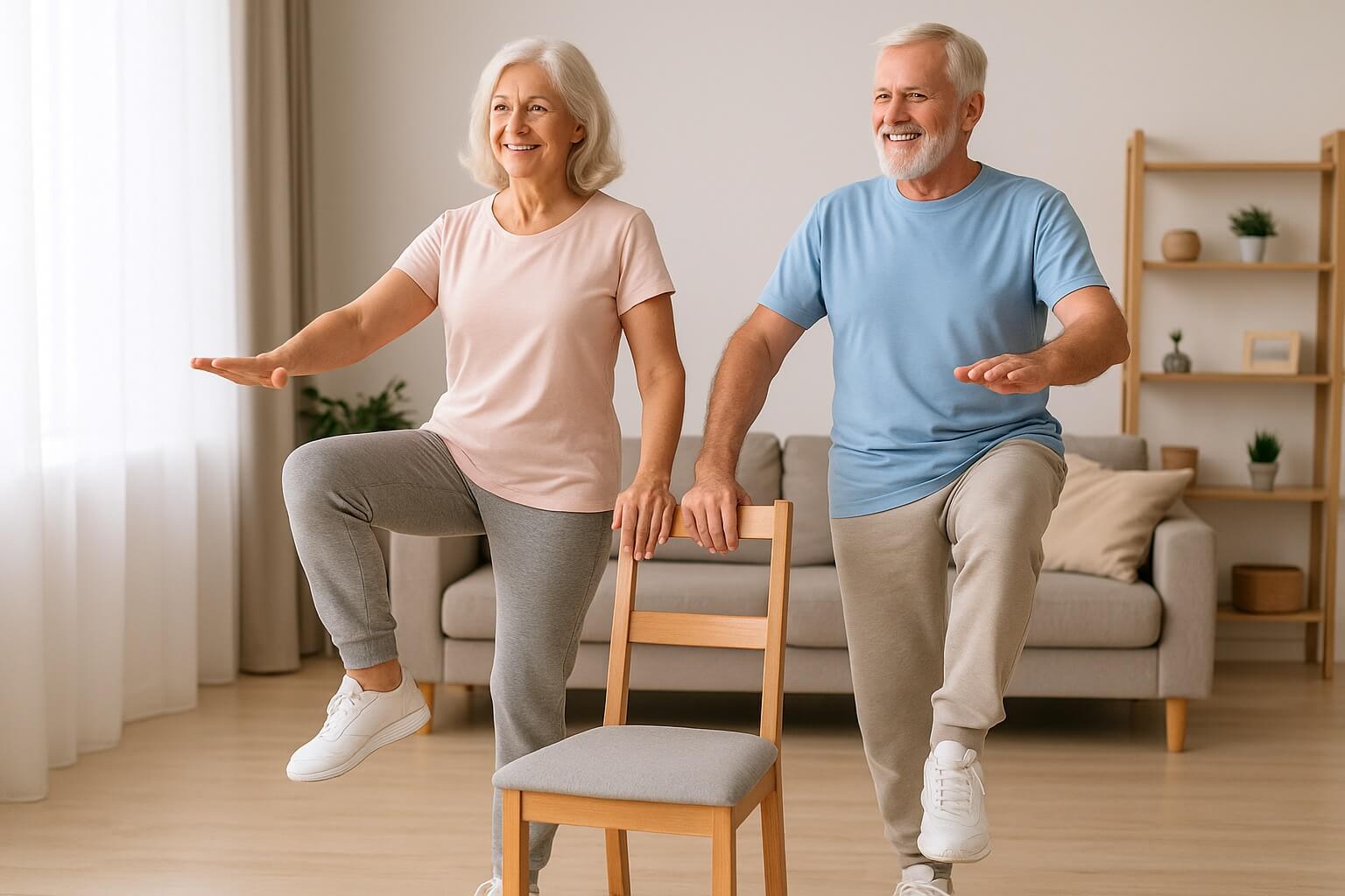 Combine levantar e sentar, alongamentos e equilíbrio lateral. Se possível, pratique perto de uma parede ou cadeira firme.